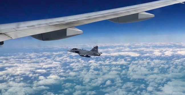 Nem gyakorlat! Egy B–737-es utasa fotózta a magyar légtérben ezt az éles elfogásra érkezett Gripent.