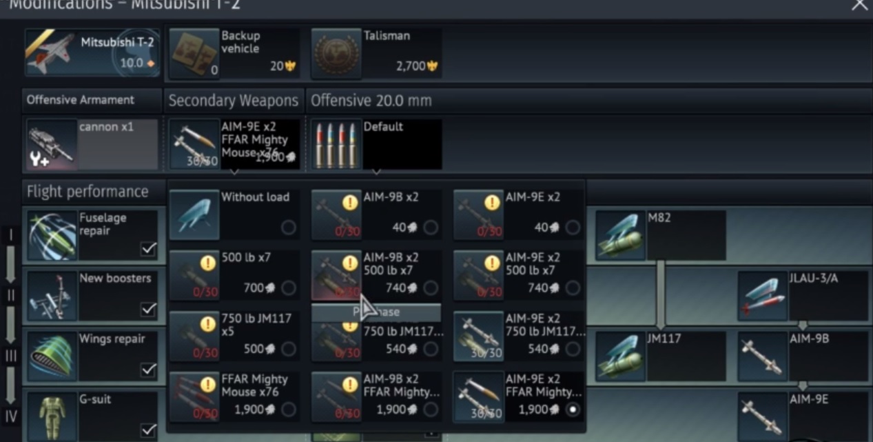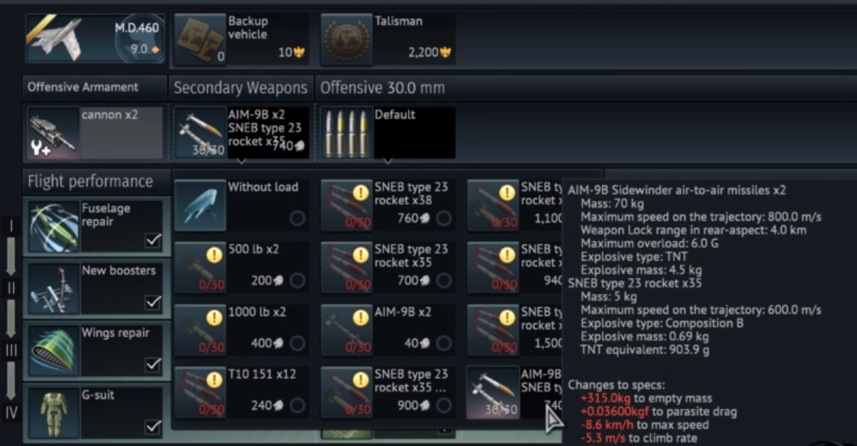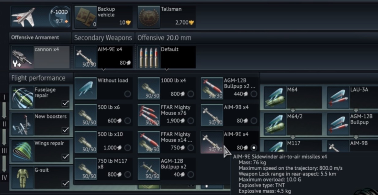 - Lesznek behúzható rakétakilövő állások, amiket ha a pilóta behúz, akkor a rakéták gépre gyakorolt negatív hatásai törlődnek, kiengedéskor újra aktiválódnak.