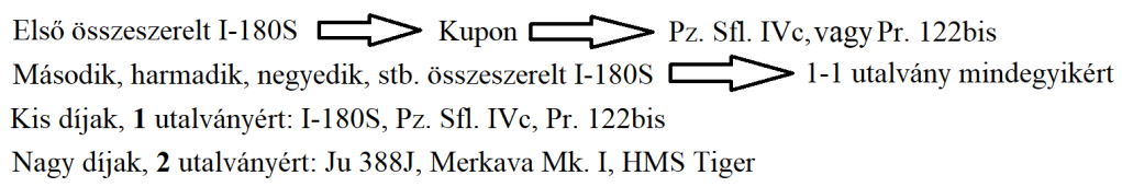 - A nagy díjak (Ju 388J, Merkava Mk. I, HMS Tiger) két utalványba kerülnek.