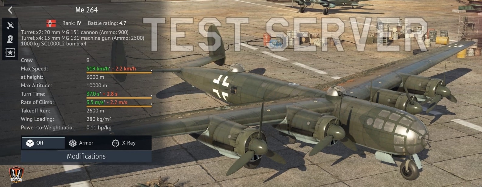 A gaijin egy nagyon kezdeti darabot hoz be, így megérthető, hogy nem lehet a legnagyobb terhet rápakolni, mindamellett, az is fura lenne, ha rá lehetne pakolni a 14 tonna terhet, és a 15,000 km-re elég üzemanyagot. Talán a legjobb megoldás az lenne, hogy a kiválasztott bombateher csökkentené az üzemanyag mennyiség kiválasztásának lehetöségeit, de ennek behozatalára egy új funkciót kellene a játékba építeni, amivel most a gaijin nem akarja az idejét vesztegetni, inkább az 1.89-re és a WWM-ra koncentrál.