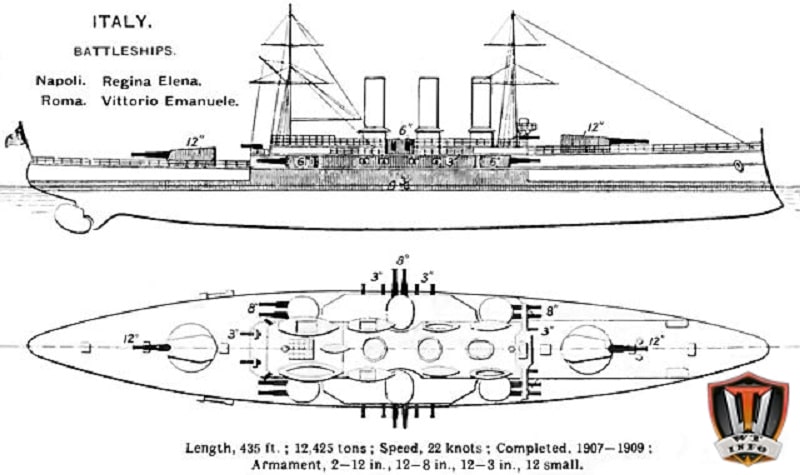 (Példaként a megelőző Regina Elena csatahajó osztály fegyverzete két* 30 cm-es, 12 db 20 cm-es, 6 db 15 cm-es és 16 db 76 mm-es ágyúból állt.)