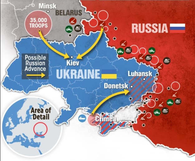 Az orosz hadmozdulatok elsődlegesen a Donbas régiójában történtek. A főbb haderők elfoglalták Kharkiv/Harkov, Luhansk, Mariupol városát, emellett partra szálltak Odessa kikötőjében, aminek támogatására további csapatok indultak a Krím-félszigetről. Az ukrán főváros Kijev felé pedig Fehéroroszországból indult orosz csapatok tartanak, amik azóta a város katonailag fontos területét el is foglalták.